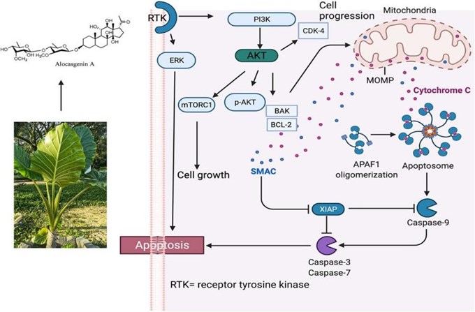 | Hình 1. Hoạt tính chống khối u của Alocasia được đề xuất thông qua cơ chế apoptosis nội tại. (Wei & cs, 2015) |