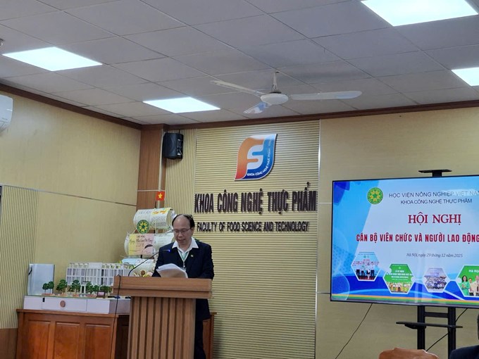 Thực hiện chỉ đạo của Đảng ủy và Ban Thường trực CBVC và NLĐ Học viện Nông nghiệp Việt Nam, chiều ngày 29 tháng 12 năm 2025 Khoa Công nghệ thực phẩm đã long trọng  tổ chức Hội nghị Cán bộ, viên chức và người lao động năm học 2025. Đây là hoạt động thường niên có ý nghĩa quan trọng, nhằm đánh giá, tổng kết kết quả thực hiện trong năm 2025 và cũng là dịp để cán bộ, viên chức và người lao động được bày tỏ nguyện vọng, kiến nghị quyền lợi chính đáng đến với các cấp lãnh đạo đồng thời đề ra phương hướng, nhiệm vụ và các giải pháp thực hiện trong năm 2026.