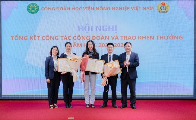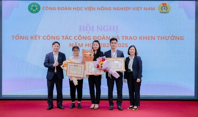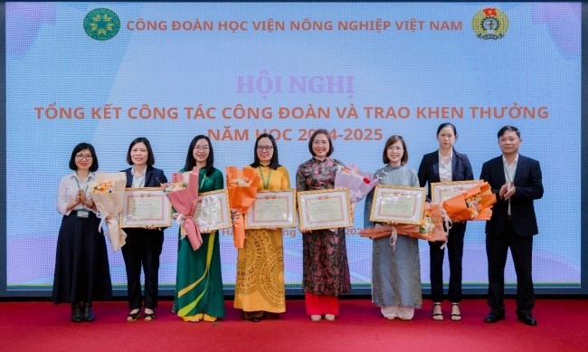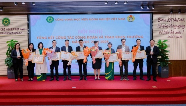 Cũng tại Hội nghị, Công đoàn Học viện đã công bố các quyết định và trao bằng khen, giấy khen của Tổng Liên đoàn Lao động Việt Nam, Công đoàn Nông nghiệp và Môi trường Việt Nam, Công đoàn Học viện Nông nghiệp Việt Nam cho các tập thể, cá nhân có thành tích xuất sắc trong hoạt động công đoàn năm học 2024 – 2025.