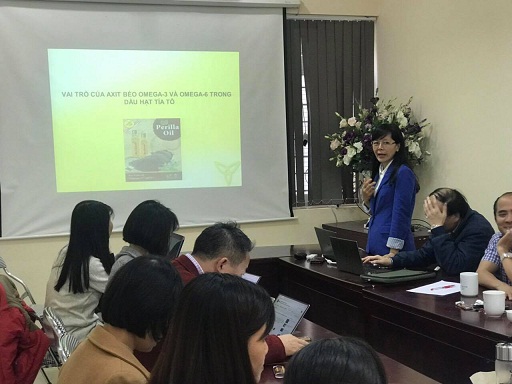 Kết thúc chương trình Seminar là bài trình bày của TS. Nguyễn Thị Hoàng Lan về vai trò của các axit béo omega-3 và omega-6 trong dầu hạt tía tô. Bài tham luận cho thấy Hàm lượng dầu trong hạt tía tô khoảng 33-42% (so với khối lượng hạt khô) tùy thuộc vào giống và điều kiện canh tác. Axit béo chính và có giá trị nhất của dầu hạt tía tô là axit a-linolenic (omega-3) với hàm lượng khoảng 57-62%. Với hàm lượng này, dầu hạt tía tô được xem là dầu chứa nhiều axit omega-3 nhất trong số các loại dầu thực vật thông dụng trên thế giới. Ngoài ra, trong dầu còn có axit linoleic (omega 6) với hàm lượng 15-17% . Dầu tía tô thuộc loại dầu salat được sử dụng rộng rãi trong đời sống và sản xuất. Hướng sử dụng đang được nhiều người quan tâm hiện nay là sử dụng dầu tía tô làm nguyên liệu để sản xuất omega-3 thực vật, phục cho sản xuất thuốc và thực phẩm chức năng.